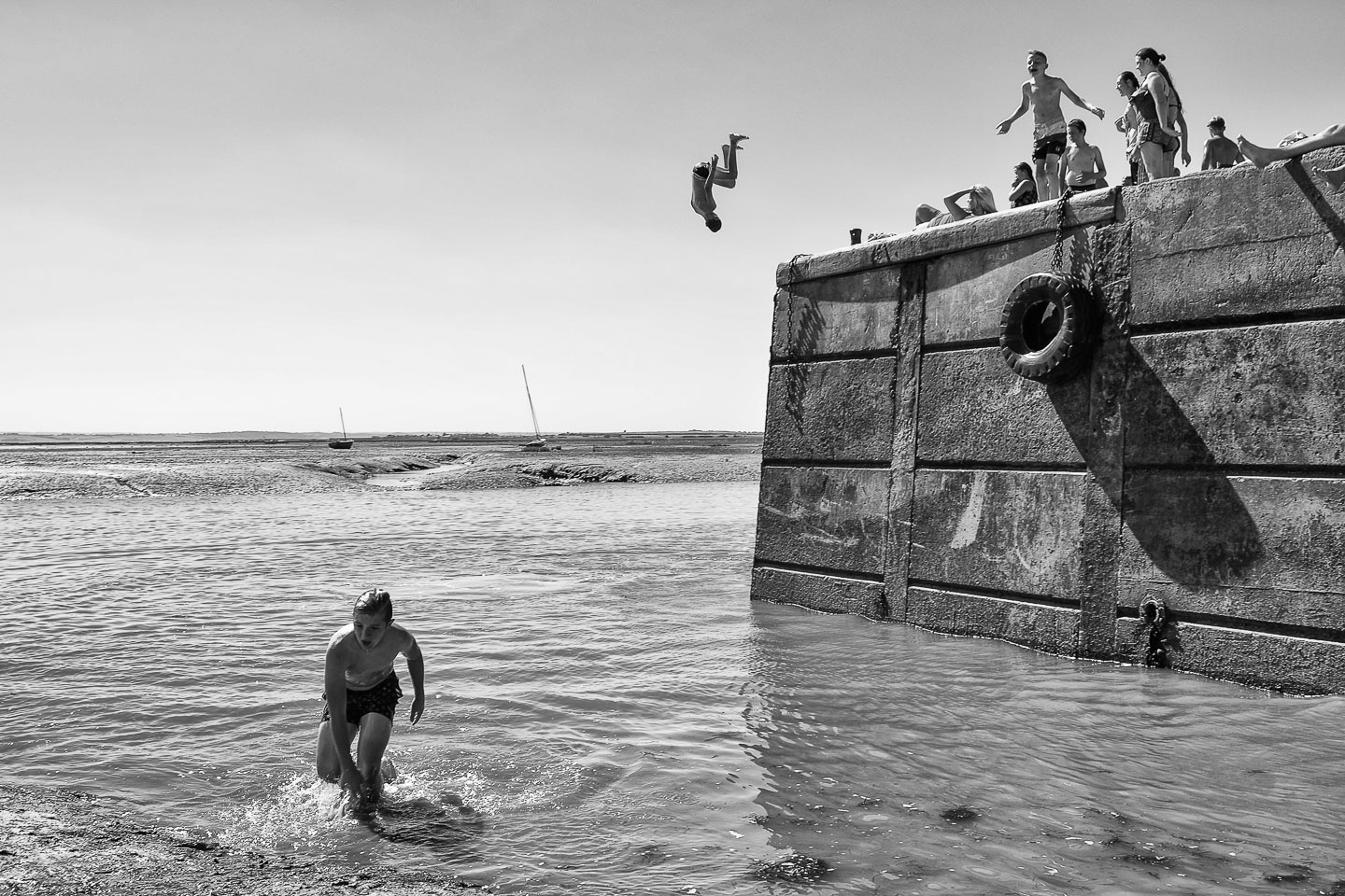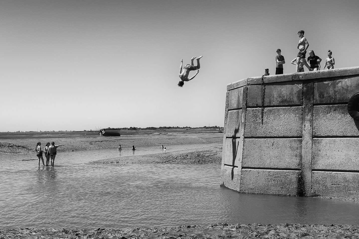 In Leigh’s Old Town on summer weekends, the two wharves at its most easterly point are magnets to visitors. If the tide is up, the longing to leap into the estuary is strong. It isn’t enough for these thrill-seekers to sit and dangle their feet over the edge. They need the rush of hurling themselves off it. The urge to jump is the urge to live, and the greatest endorphin burst of all is in the split second when they are airborne.